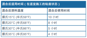 ?涂裝前最好將基料與固化劑各組份或調(diào)配混合后漆料的溫度調(diào)控到攝氏15°C (華氏59°F)以上, 不然則可能需要額外添加稀釋劑將漆料的粘度調(diào)整到適宜施工的粘稠狀態(tài)。