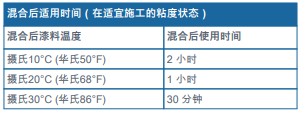 ?涂裝前最好將基料與固化劑各組份或調(diào)配混合后漆料的溫度調(diào)控到攝氏15°C (華氏59°F)以上, 不然則可能需要額外添加稀釋劑將漆料的粘度調(diào)整到適宜施工的粘稠狀態(tài)。